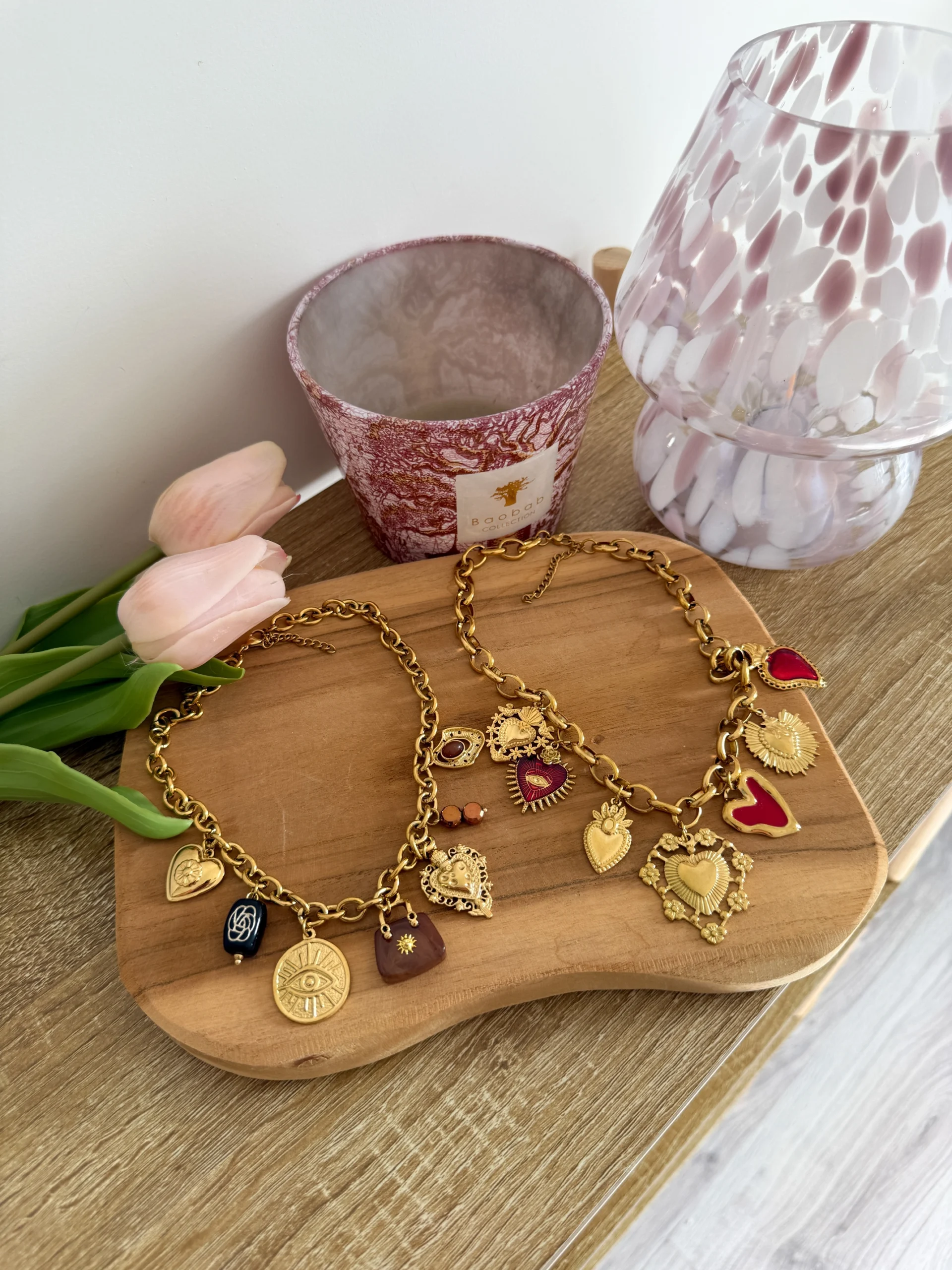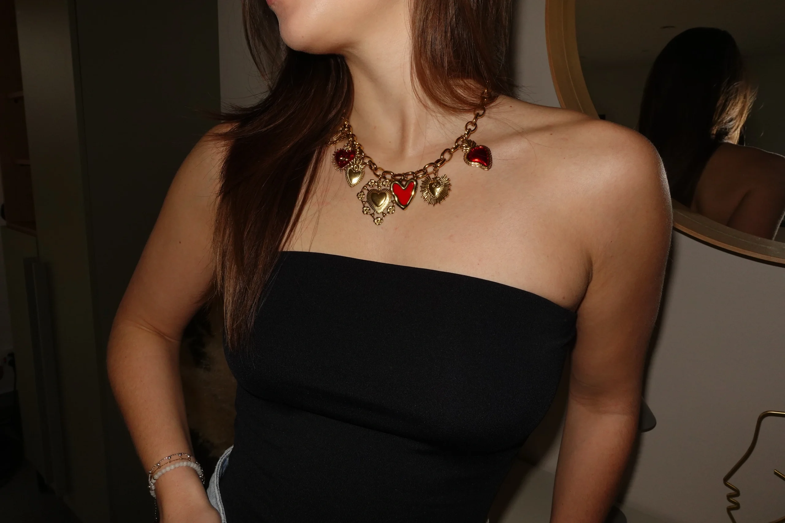 Avec sa chaîne dorée et ses charms en forme de cœurs, il attire le regard et sublime le décolleté avec style.