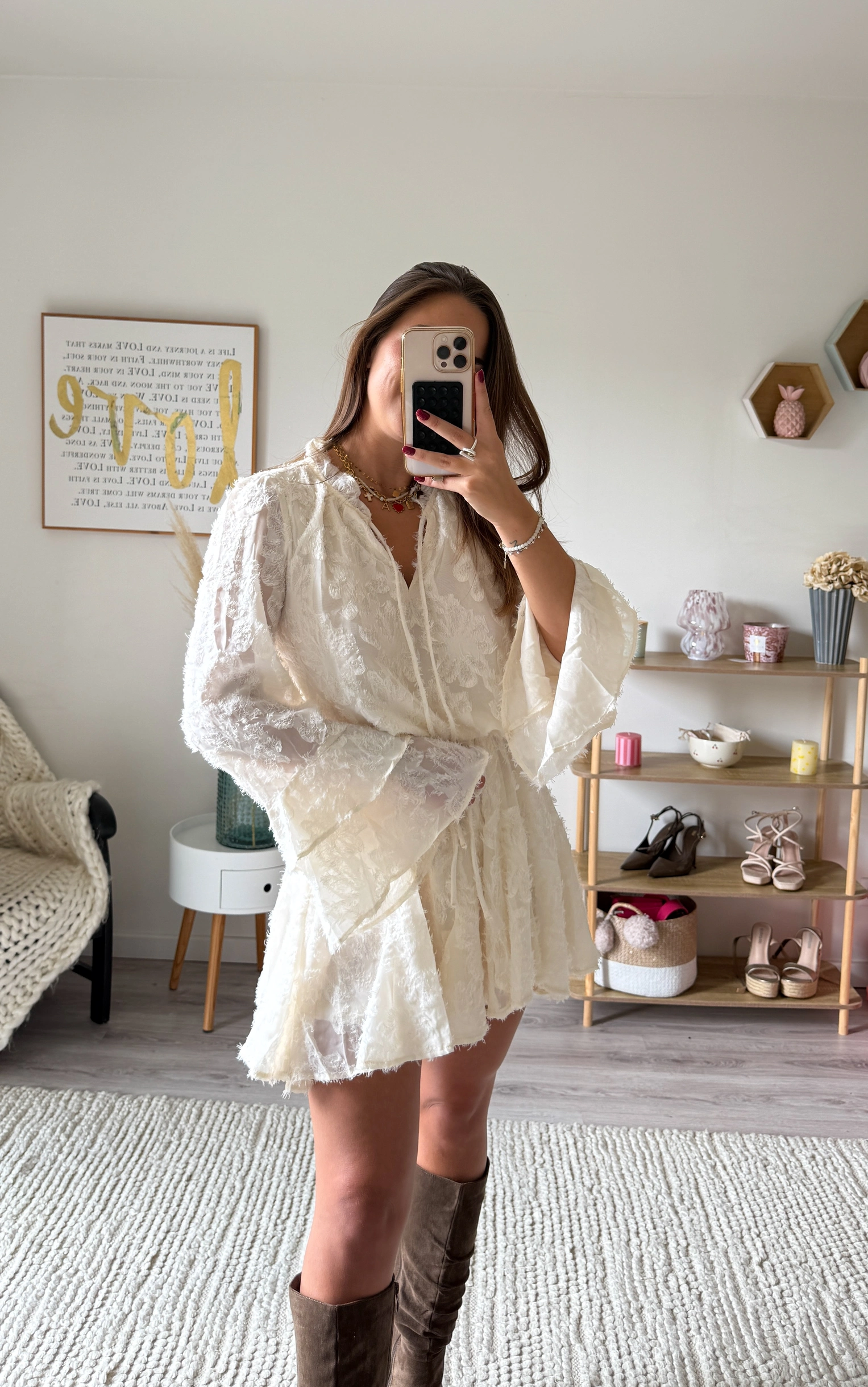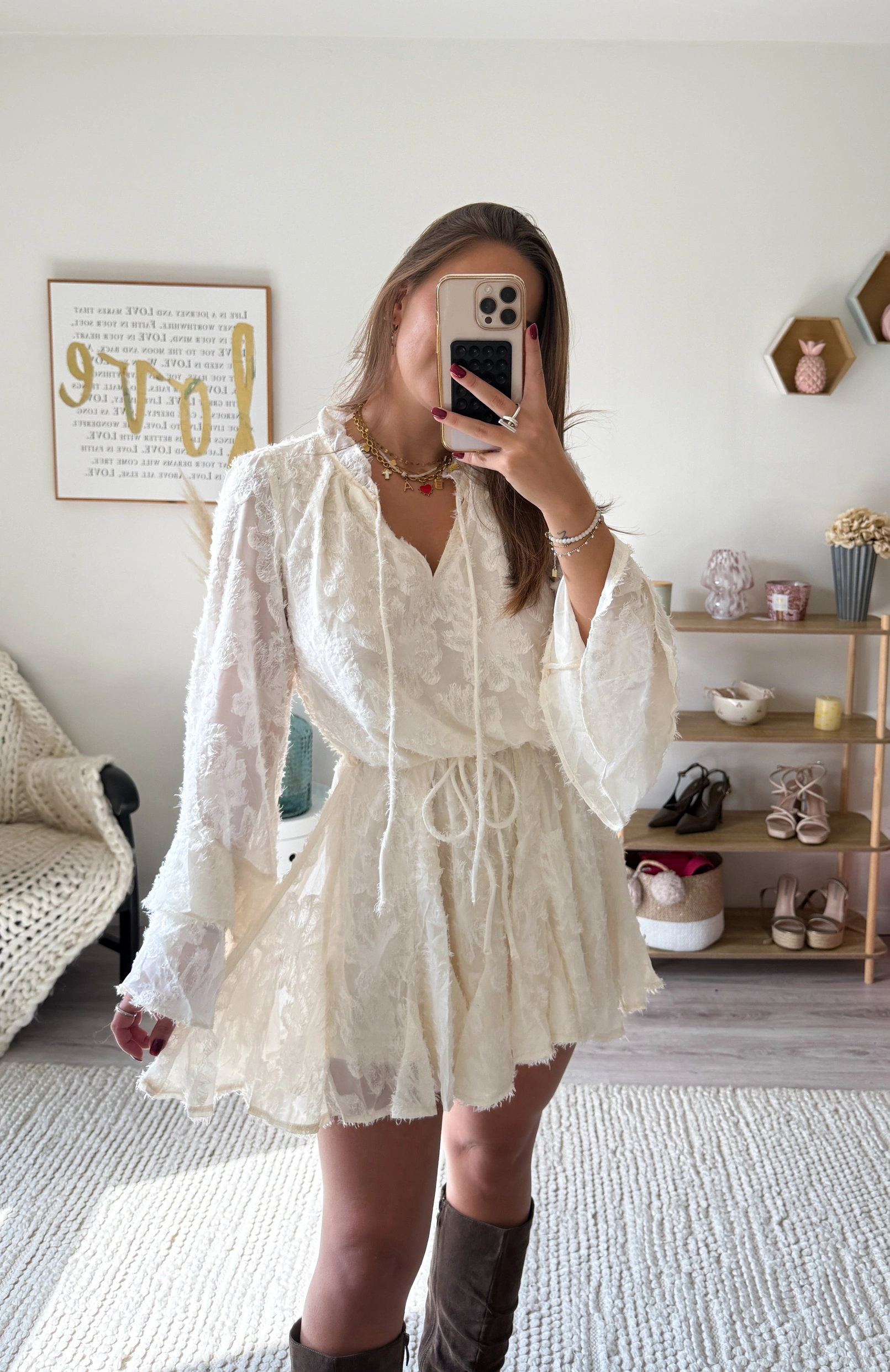 Avec ses manches longues évasées et sa coupe fluide resserrée à la taille par un lien, elle met subtilement en valeur la silhouette tout en garantissant confort et féminité.