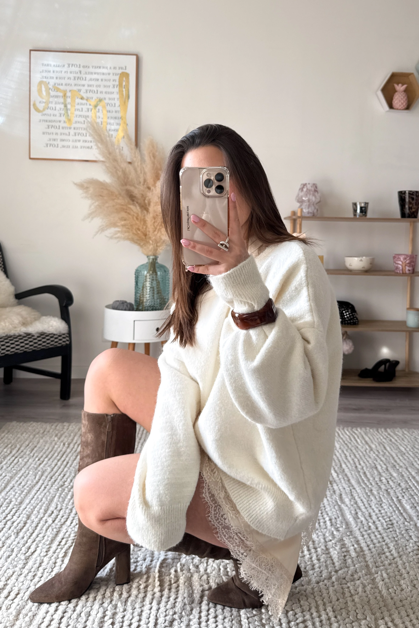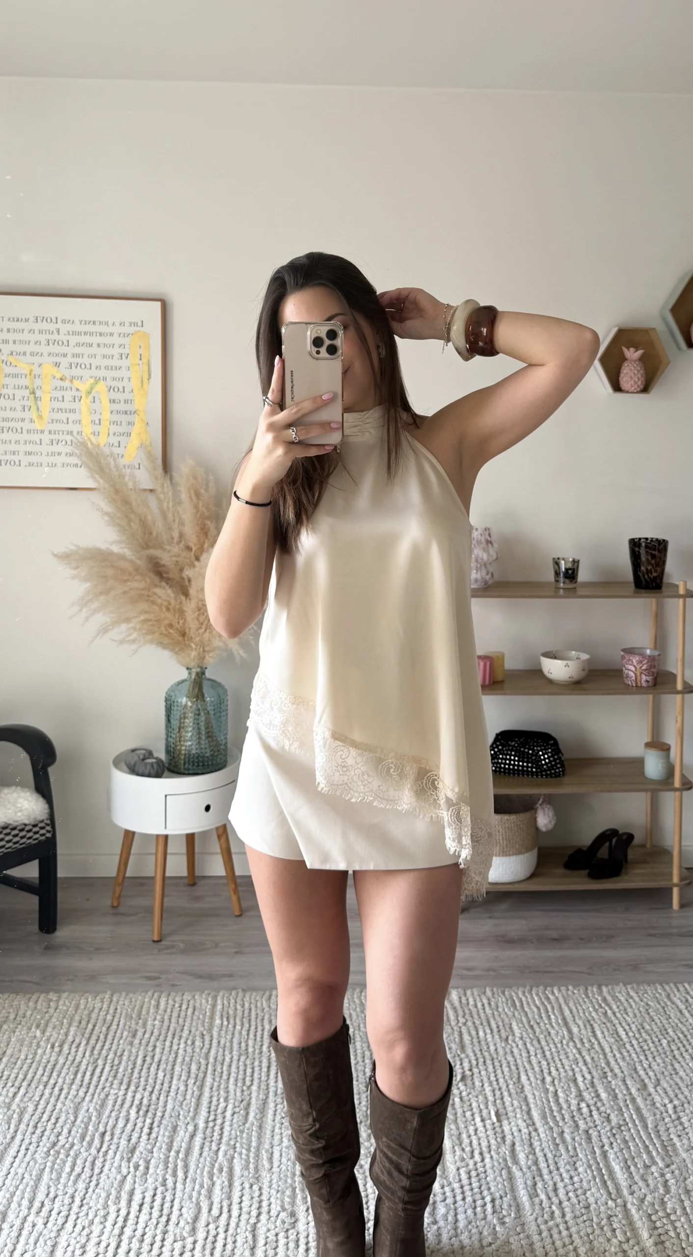 On craque pour ses détails en dentelle délicate sur le bas, qui ajoutent une touche romantique et féminine, ainsi que pour son col montant chic et moderne. Facile à porter, il se suffit à lui-même pour un look élégant, que ce soit avec des bottes, des sandales ou des talons.